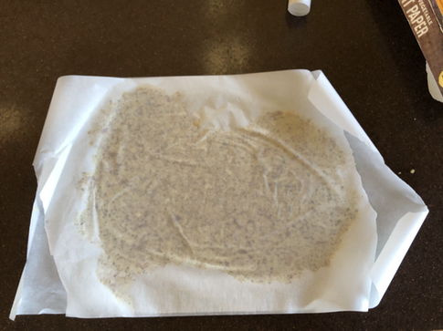 Use your rolling pin to roll out the dough to your desired thickness. The more muscle you put behind it, the thinner and crunchier the crackers will be! Around 1/8 inch thickness is what you're going for. The dough will not roll out in a perfect shape and it doesn't need to-you're the boss, so it can look however you want. TIP: if you don't have a rolling pin you can use a bottle of wine or olive oil bottle to roll out the dough.